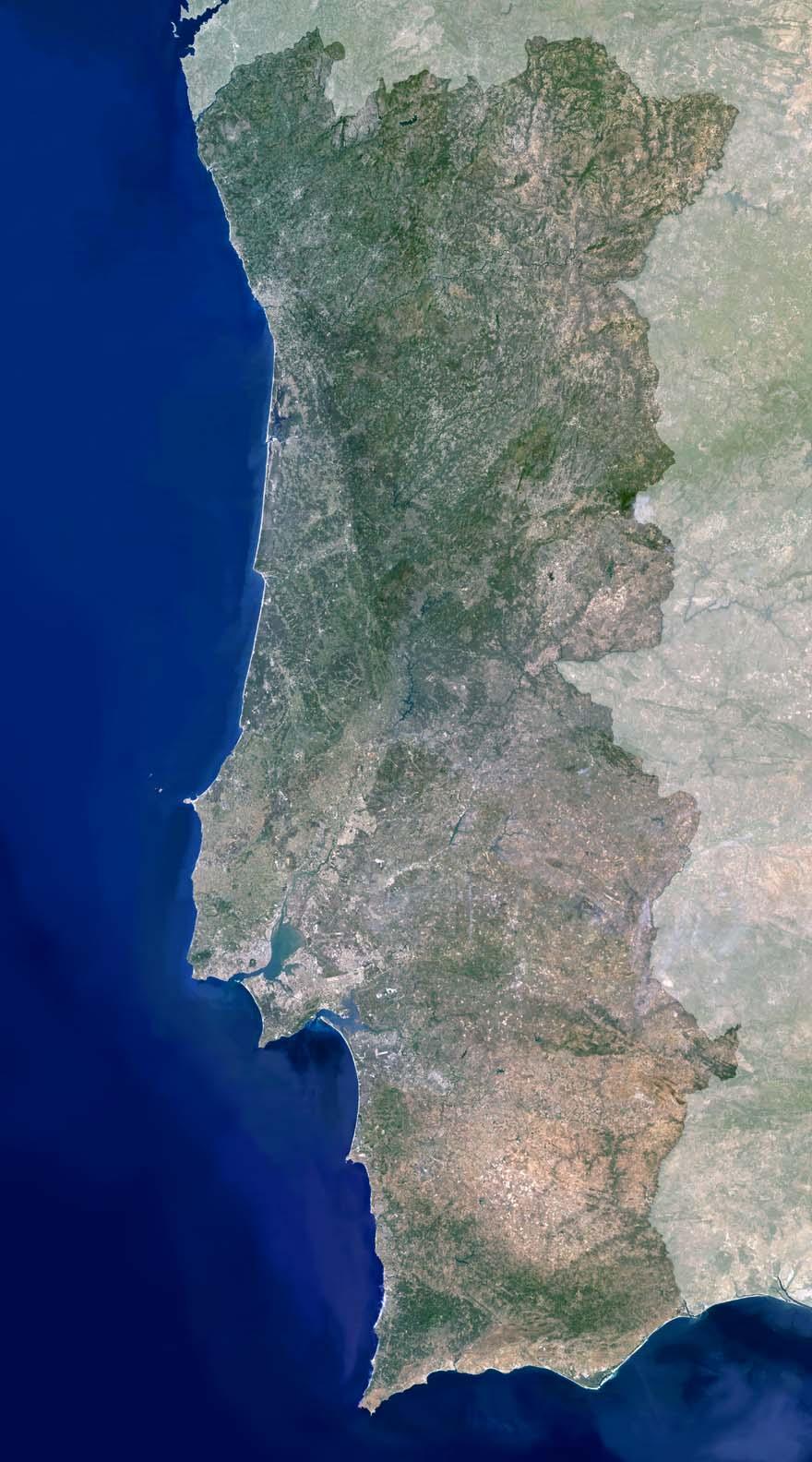 Carte du Portugal par satellite. Portugal carte satellite (Europe du Sud - Europe) à imprimer. Portugal carte satellite (Europe du Sud - Europe) à télécharger. Le Portugal est une nation côtière du sud-ouest de l'Europe, située à l'extrémité occidentale de la péninsule ibérique, bordée par l'Espagne (sur ses frontières nord et est : un total de 1 214 km), comme le montre la carte satellite du Portugal. Le territoire portugais comprend également une série d'archipels dans l'océan Atlantique (les Açores et Madère), qui sont des îles stratégiques le long des approches maritimes occidentales du détroit de Gibraltar et de la mer Méditerranée. Au total, le pays occupe une superficie de 92 090 km2 (35 560 mi2), dont 91 470 km2 (35 320 mi2) de terres et 620 km2 (240 mi2) d'eau.